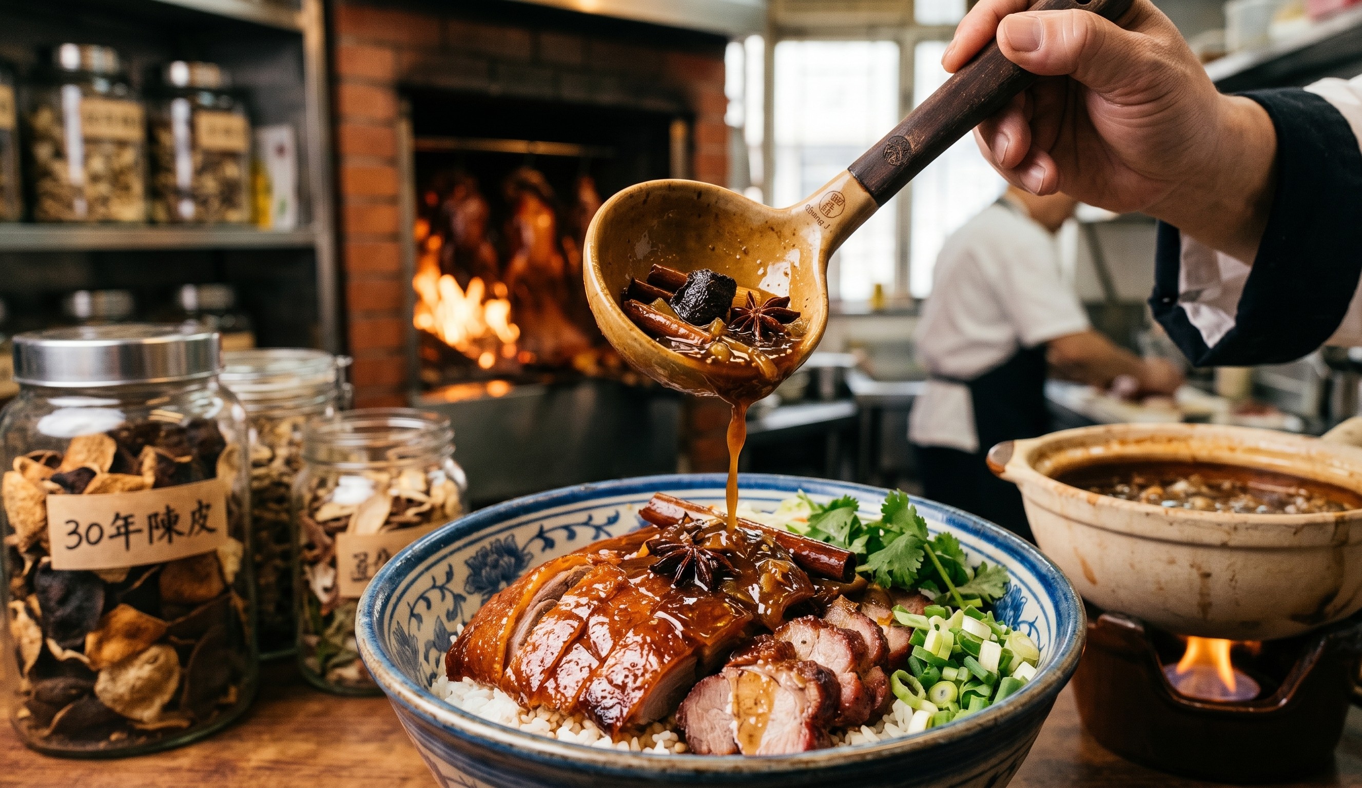 這碗被譽為「強記靈魂」的秘製醬汁,絕非尋常。我們堅持選用極其珍貴的三十年新會老陳皮,其歲月沈澱出的幽雅柑香,與數十種精選頂級中藥材,在文火慢燉中交織融合。老陳皮的甘醇中和了燒臘的甜膩,中藥材則賦予了層次分明的深邃底蘊。